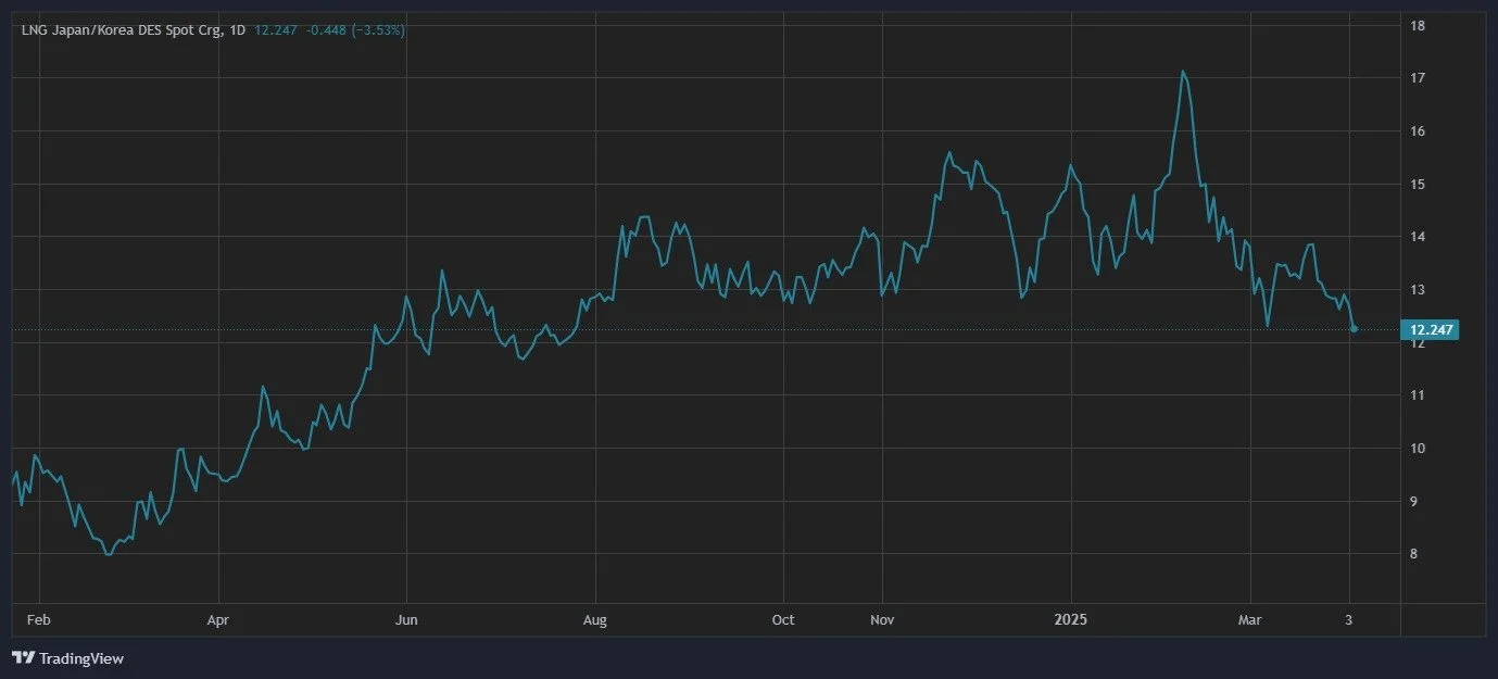 Котировки цены на спот партии СПГ с поставкой в порты Японии, Южной Кореи и китайской провинции Тайвань в январе 2024 - марте 2025 года, долларов за миллион британских термических единиц