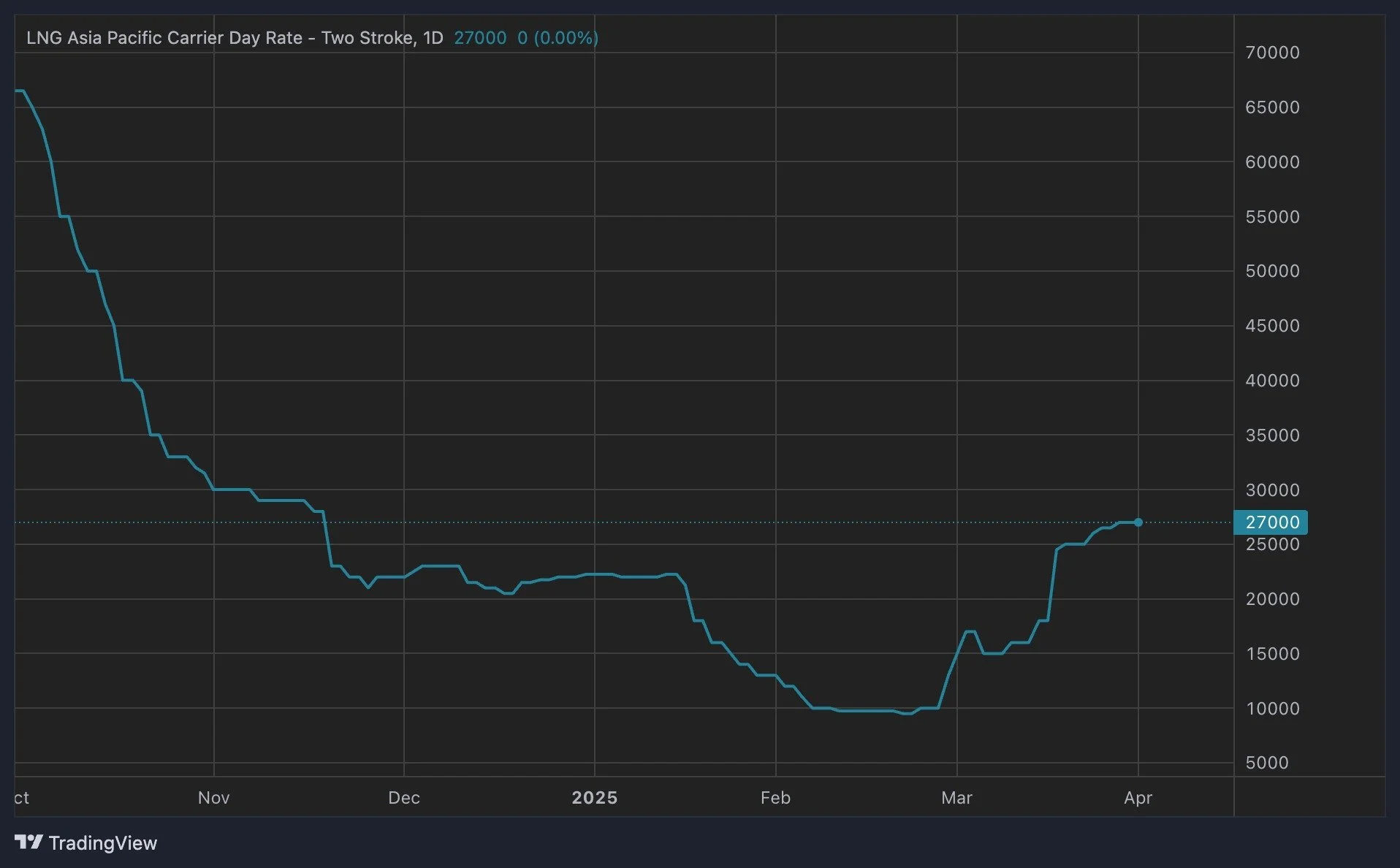В первом квартале ставки фрахта газовозов продолжили падение и составляли на минимуме 9.8 тысячи долларов в сутки за стандартный двухтопливный газовоз грузоподъёмностью 73 тысячи тонн СПГ в Тихоокеанском регионе (862 тысячи рублей в эквиваленте). Ввод новых газовозов давит на ставки.