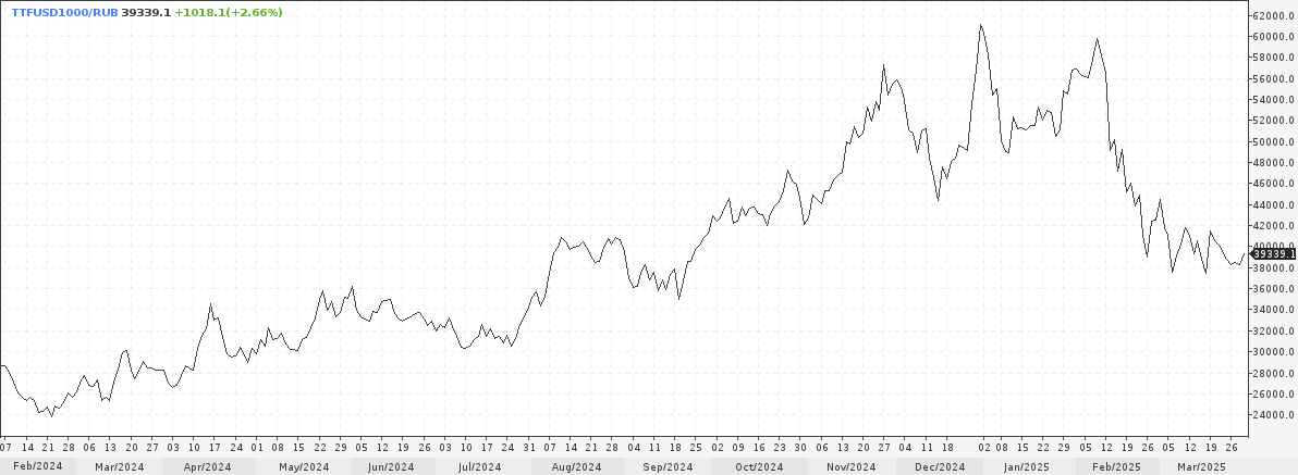 31 марта 2025 года оптовая цена на газ в рублёвом эквиваленте в Европе составляла 39 рублей за кубометр. В течение первого квартала цены колебались в диапазоне 38-60 рублей за кубометр.