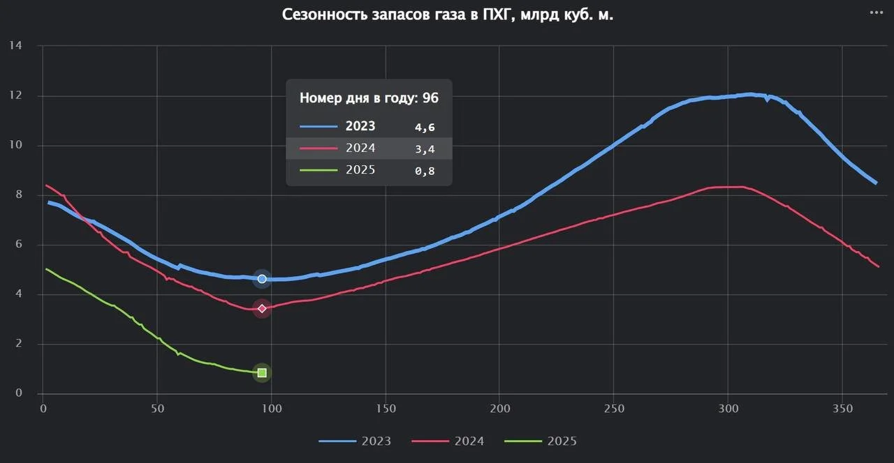 Запасы активного газа в ПХГ Украины на порядковый день в году в 2023-2025 годах