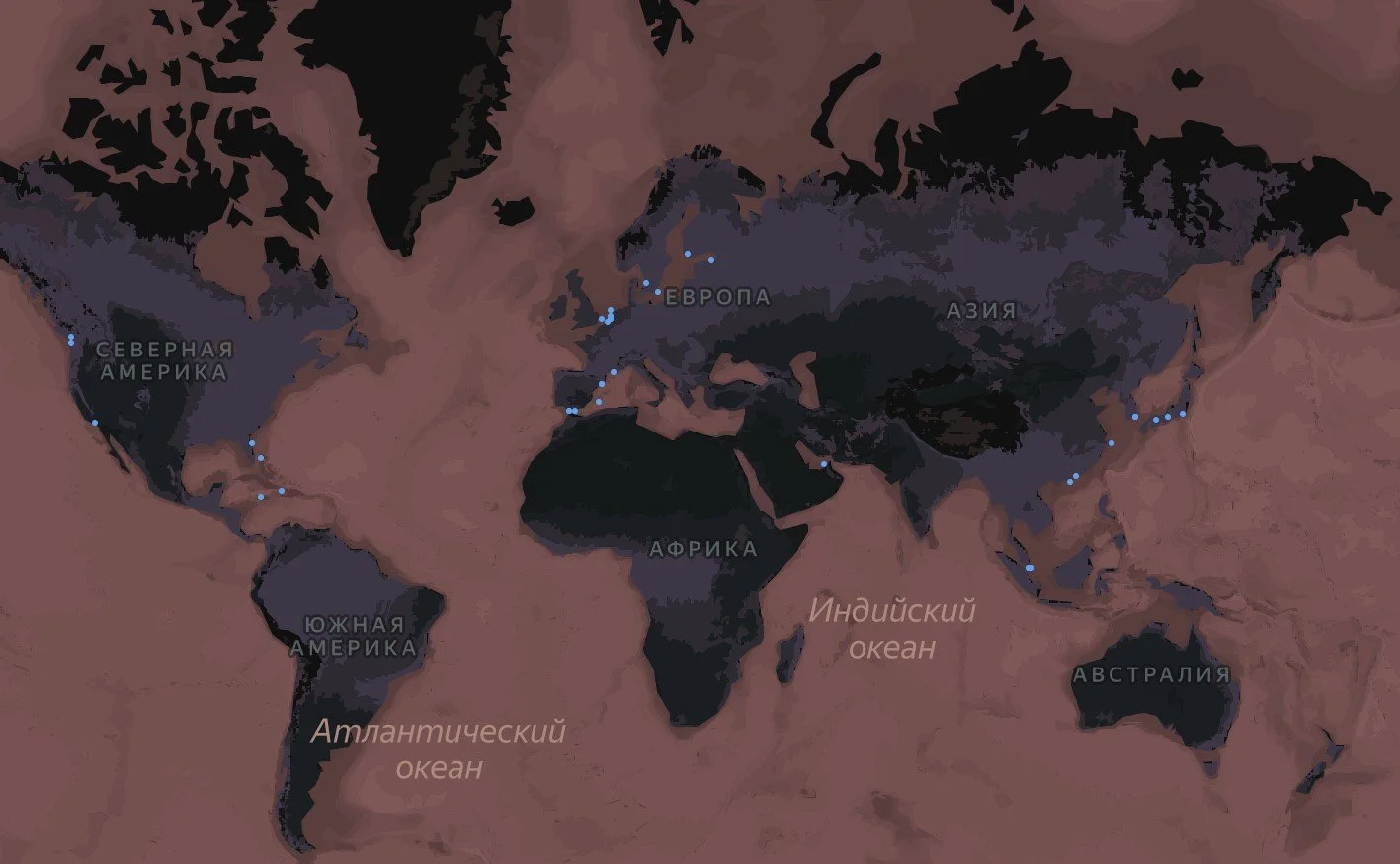 Карта расположения 39 действующих СПГ-бункеровщиков по состоянию на 7 апреля 2025 года