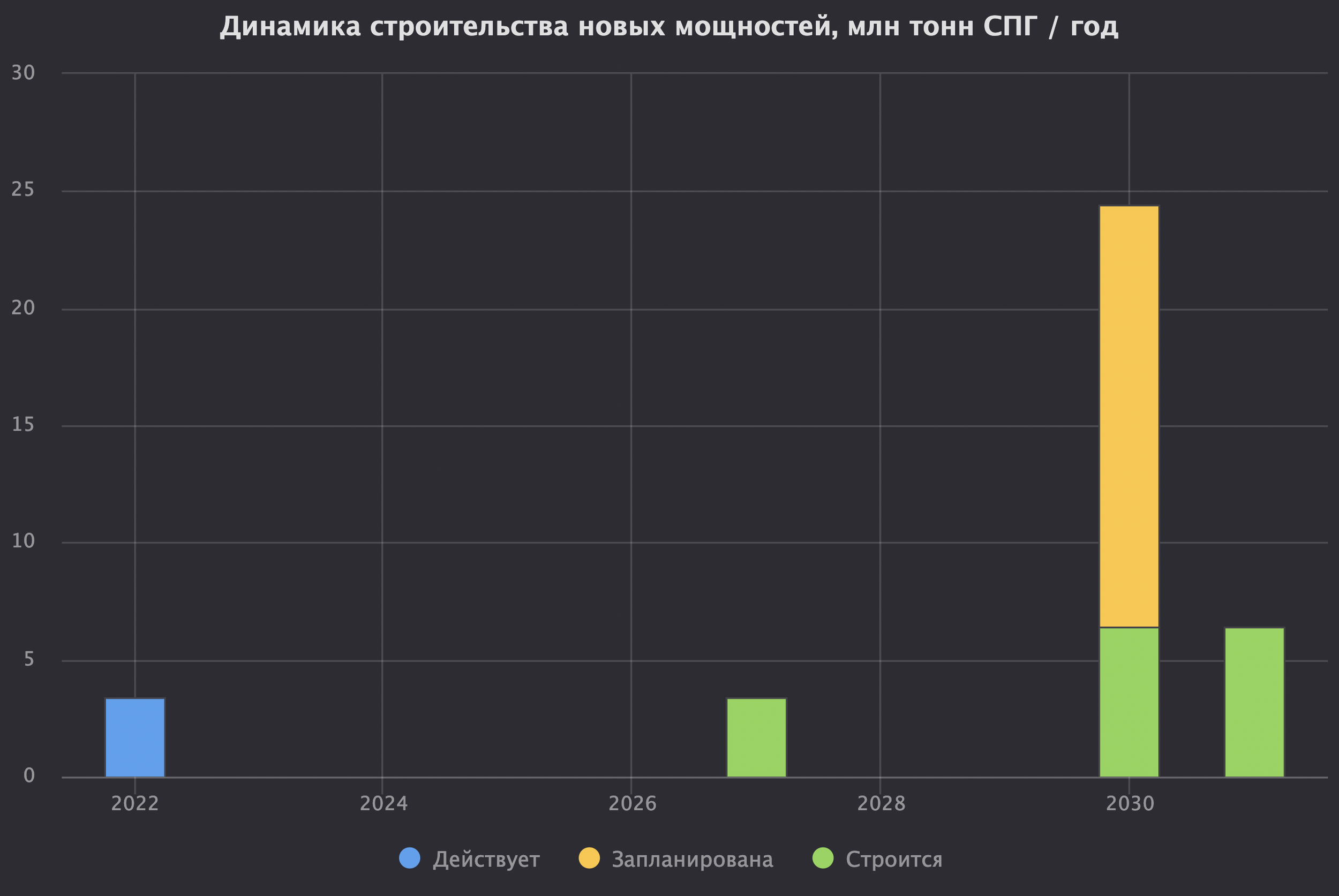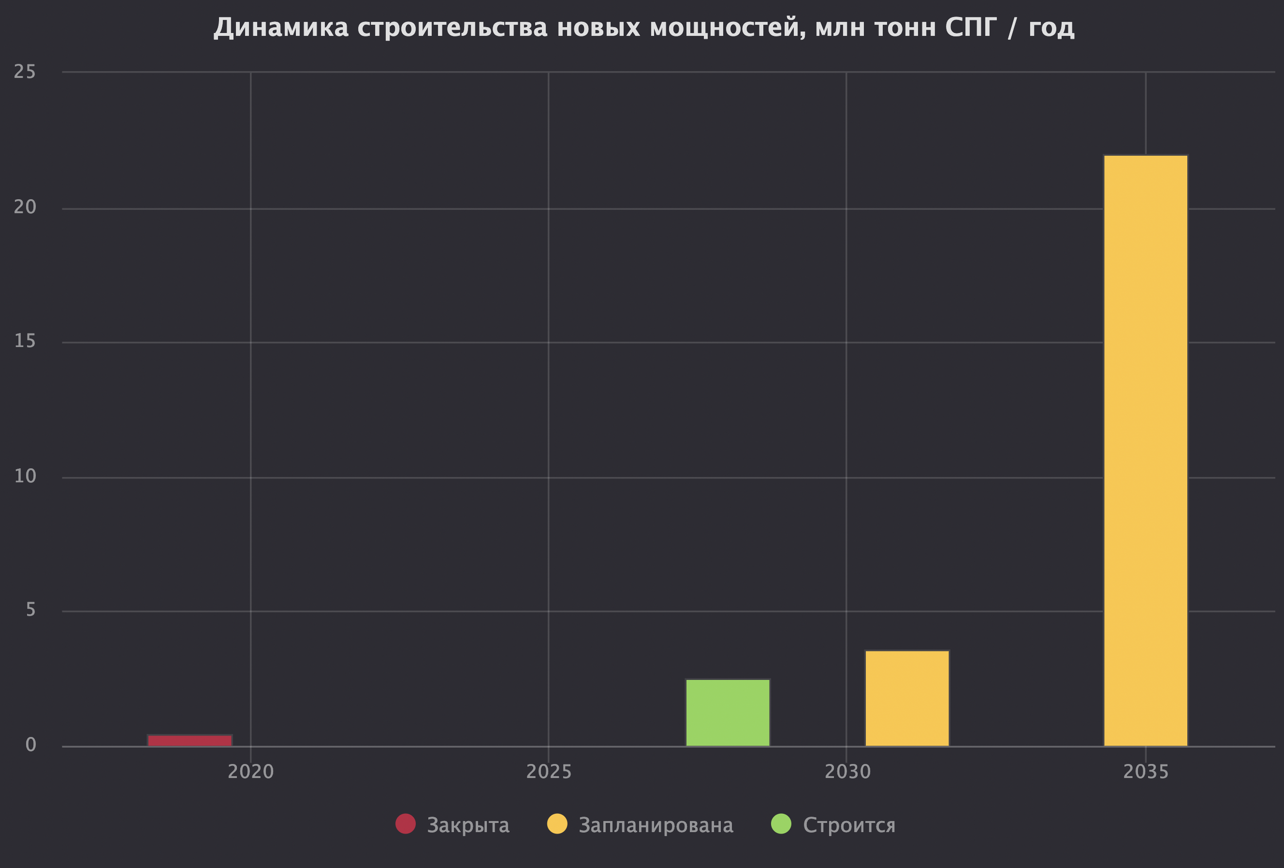 На 08.04.2026 в стадии строительства находятся мощности на 23 заводах (включая проекты расширения уже действующих заводов) общей проектной мощностью сжижения 189 миллионов тонн/год. Такой чрезвычайно высокий для любой отрасли показатель свидетельствует о грядущих в ближайшие годы изменениях в отрасли, негативных для производителей.