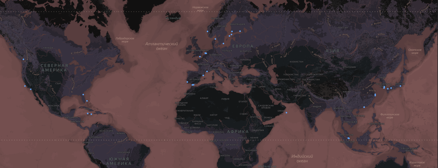 Карта расположения 43 действующего СПГ-бункеровщиков по состоянию на 1 июля 2025 года