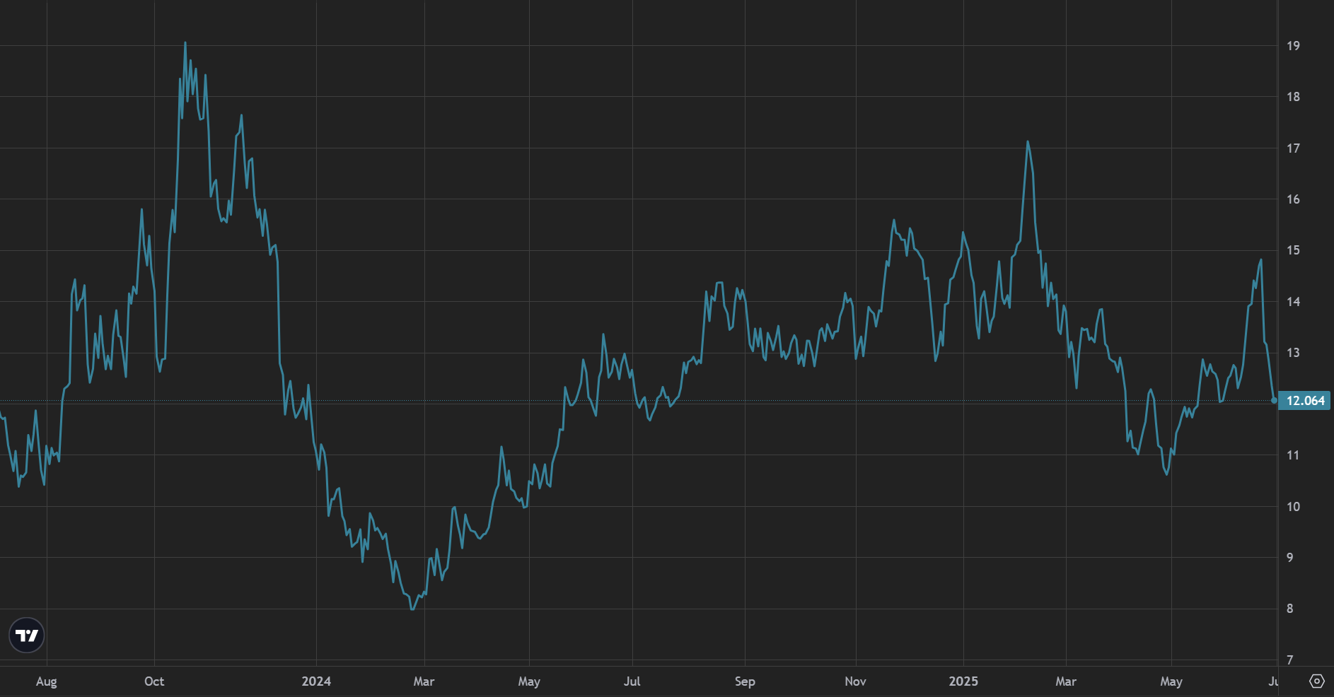Цена спот на поставку СПГ в Восточную Азию на 30.06.2025 составила 12.1 долларов США за миллион британских термических единиц, что эквивалентно 35 рублям за кубометр газа. Снижение за квартал в рублёвом эквиваленте - минус 26%, в долларовом - минус 2%.