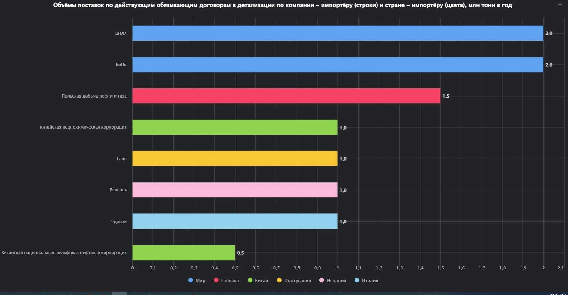 Перечень покупателей “молекул свободы” с этого завода включает британские Шелл и БиПи, польскую ПКН Орлен, испанскую Репсоль, итальянскую Эдисон, португальскую Галп, Китайскую нефтехимическую корпорацию и Китайскую национальную шельфовую нефтяную корпорацию. Совокупный объём обязывающих контрактов на поставку - 10 миллионов тонн/год (84% от проектной мощности СПГ-завода).