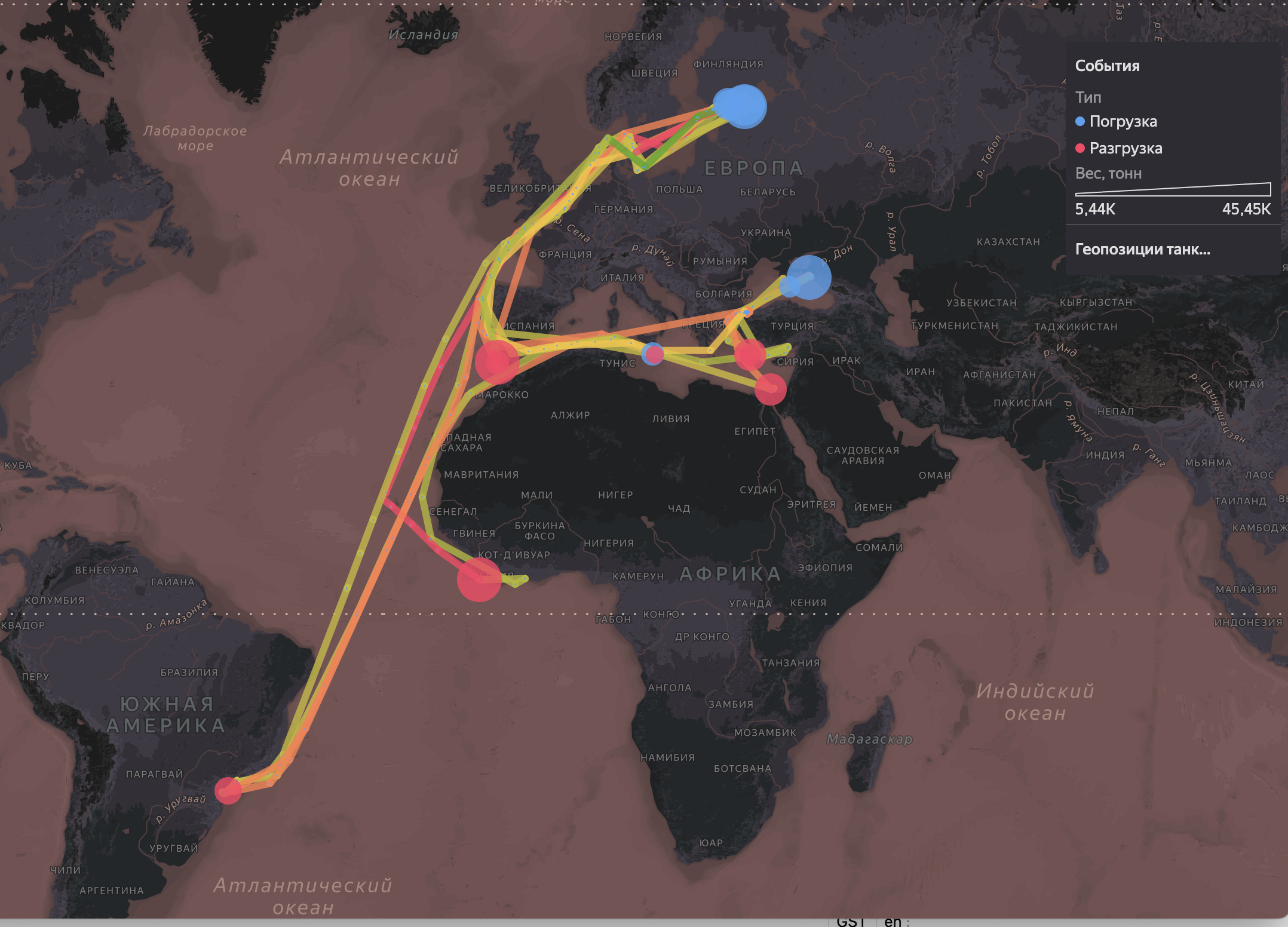 Аналитика по вояжам судов, включая места погрузки и выгрузки, маршруту транспортировки, грузу на борту.